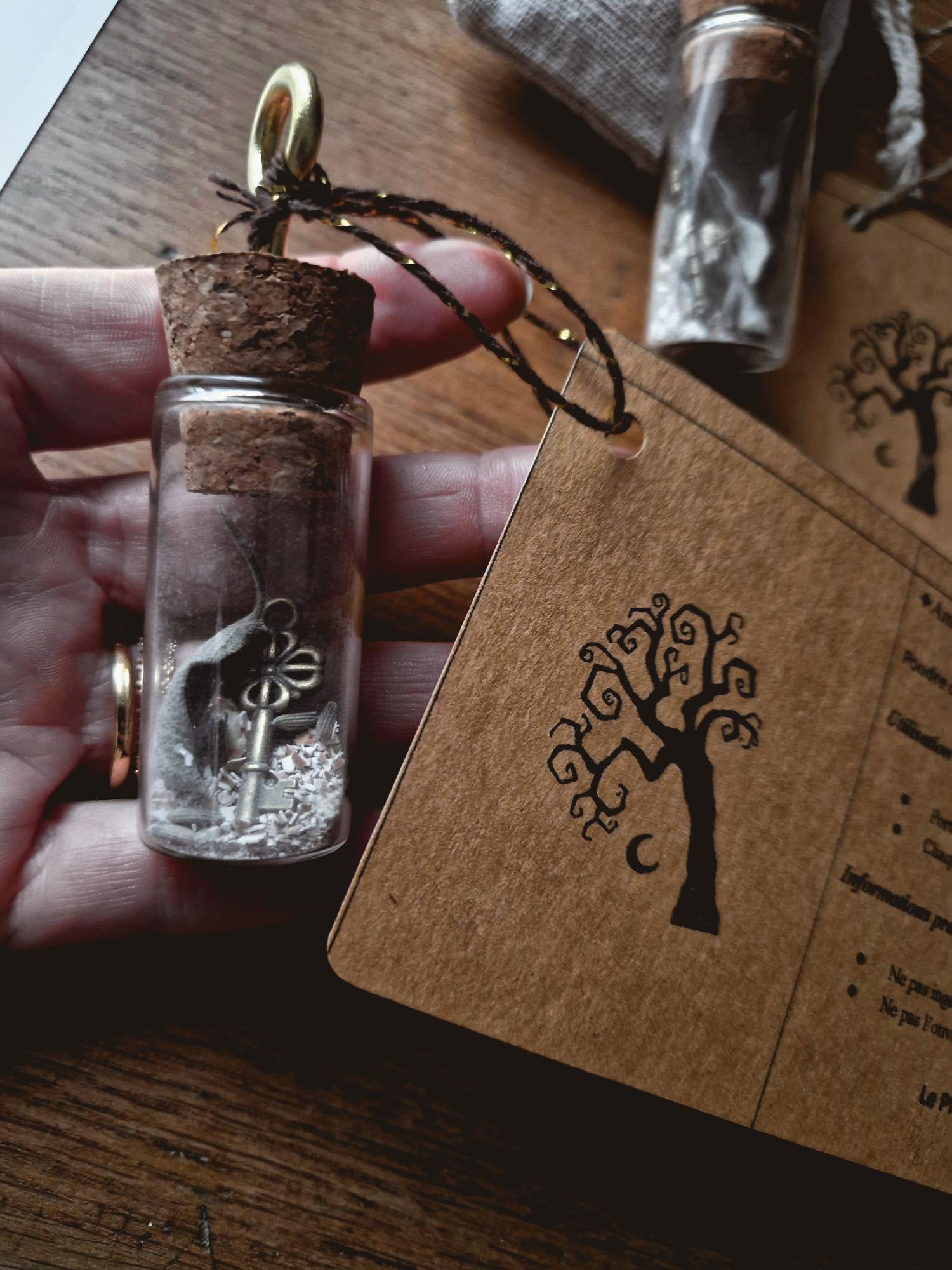 Précautions : le contenu ne doit pas être ingéré. Scellé rituellement, il est recommandé de ne pas ouvrir le flacon.