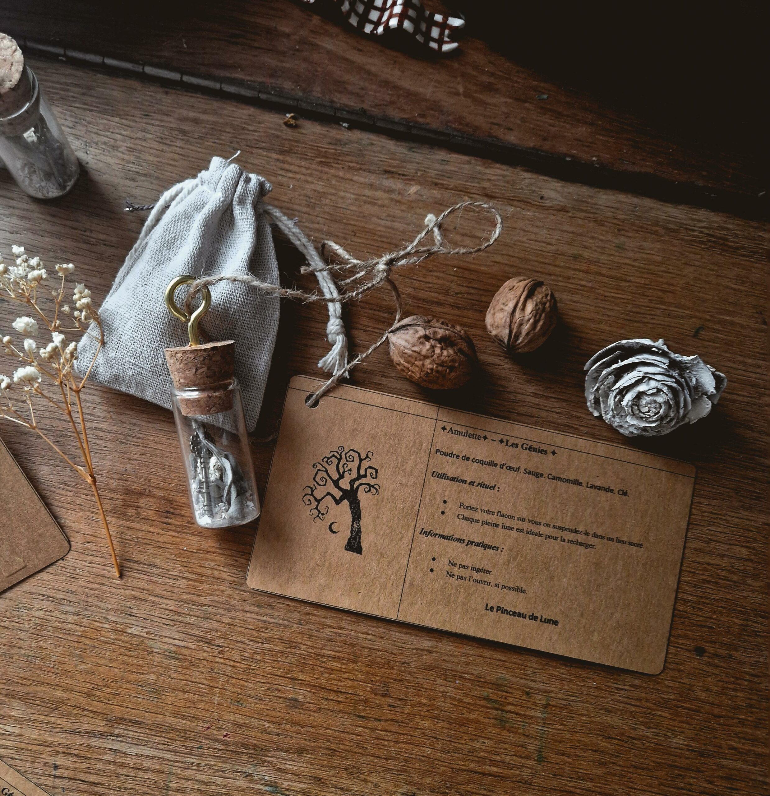 Remplies de plantes et de fleurs séchées issues de mon jardin, ces amulettes sont présentées dans un flacon de verre, consacrées par mes soins. Elles sont conçues pour être suspendues et fournies avec un joli cordon, mais vous pouvez également les poser dans un lieu sacré ou partout où vous souhaitez accueillir leur énergie. Leur étiquette informative les accompagnent ainsi qu’un petit sac en lin beige pour le transport, si vous en faites un compagnon de route.