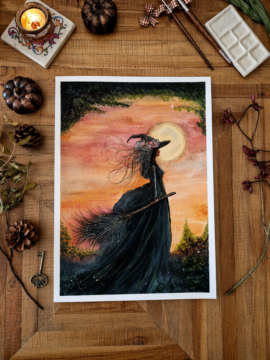 L’Alchimiste est une œuvre originale réalisée à l’aquarelle et aux PanPastel, représentant un univers lié aux connaissances, à la végétation et aux cycles naturels.